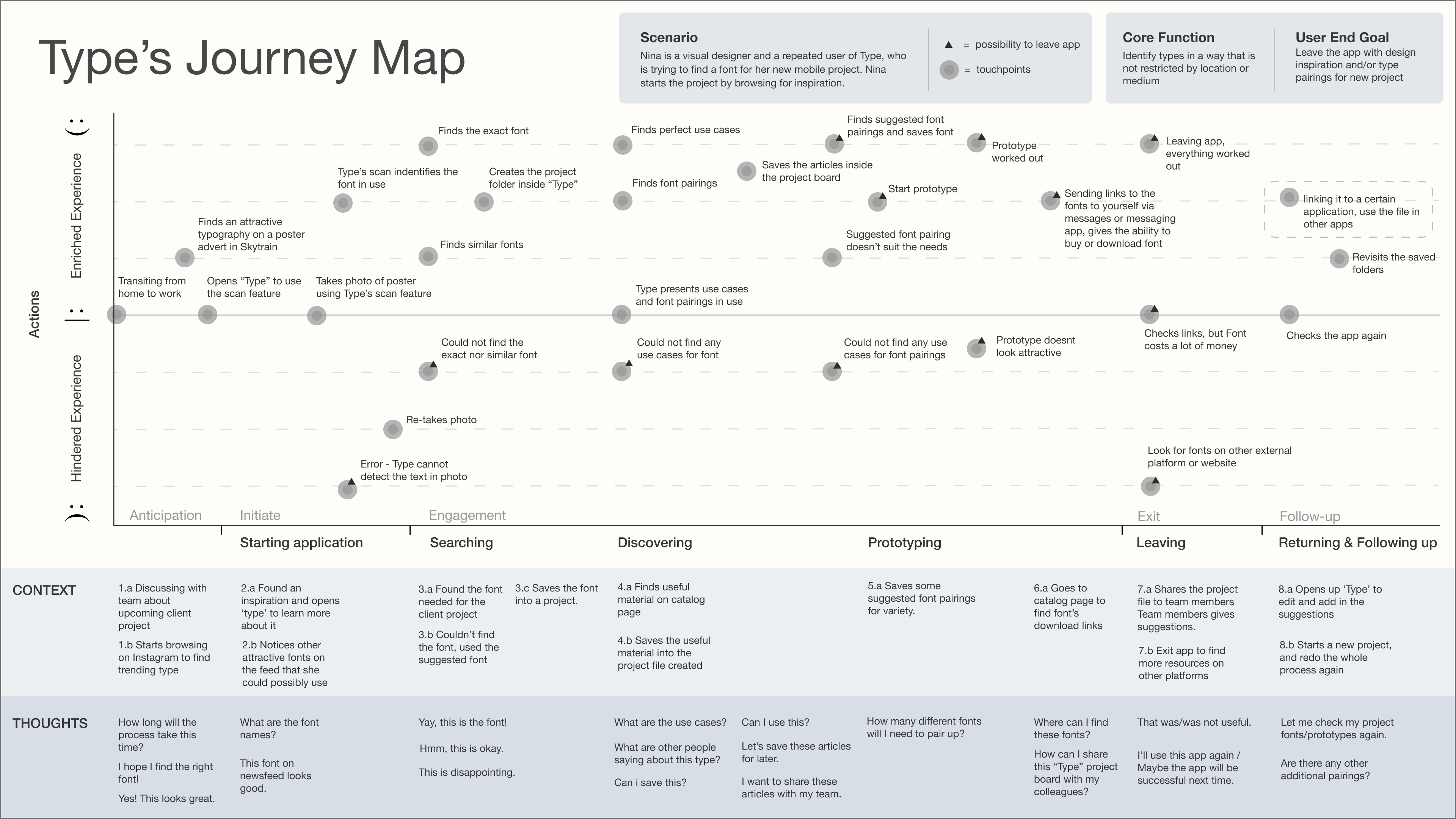 A journey map was used to understand the steps taken by font enthusiasts in gathering inspiration. This helped the team identify potential pain points and pleasure points.
